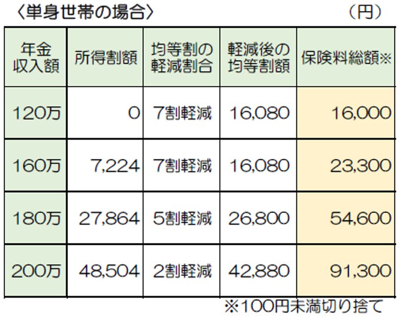 ▼例1:被保険者で単身世帯の場合(本人の収入が年金収入180万円のみの場合)