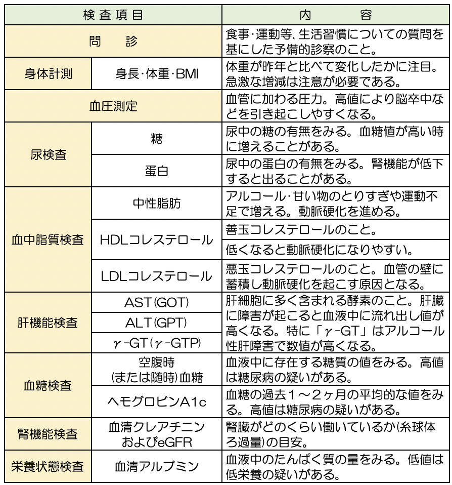 検査項目は、厚生労働省が示す「標準的な健診及び特定保健指導プログラム」に沿って検査項目を決めています。